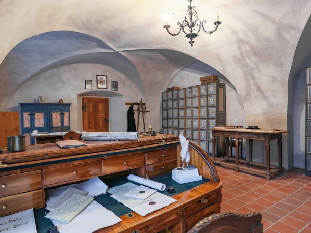 Možná právě tak mohly být vybavené jeho privátní pokoje, kuchyň či kancelář. K vidění je například okovaná pokladnice, které se zmocnila chasa, když si v roce 1590 přišla vyřídit dluhy u rytířem Davida Boryně ze Lhoty, úřední záznamy psané husím brkem, přehled sirotčích důchodů, či v kuchyni pak sopouch, pradávný předchůdce našich digestoří.
